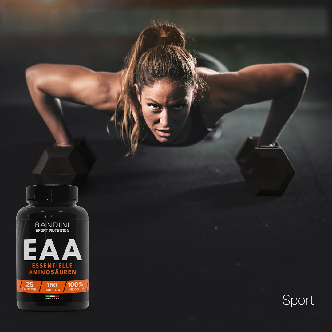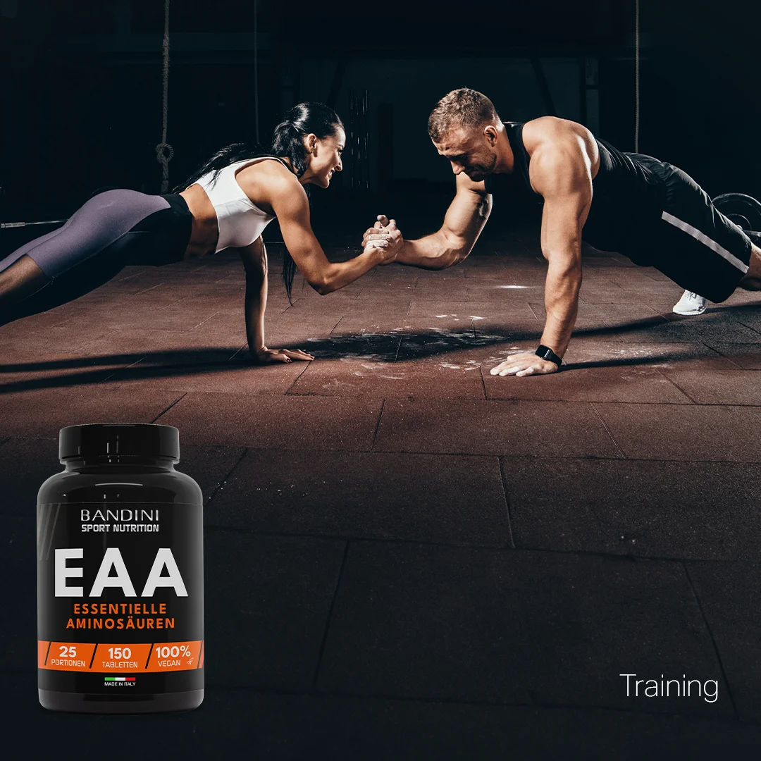 EAA ist ein Supplement aus essentiellen Aminosäuren, also Aminosäuren, die der menschliche Körper nicht selbst synthetisieren kann und die über die Nahrung aufgenommen werden müssen. Die spezielle Formulierung der verschiedenen essentiellen Aminosäuren gewährleistet eine optimale Aufnahme und zelluläre Bioverfügbarkeit. Die Aminosäuren stimulieren die Proteinsynthese, mildern Muskelschäden, helfen, die Erholungszeit zu begrenzen und wirken dem Katabolismus nach dem Training entgegen.
