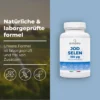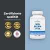 Unser hochdosiertes Nahrungsergänzungsmittel enthält 150 mcg (150 µg) Jod (aus Kaliumjodid, KI) und 100 mcg (100 µg) Selen pro Tagesdosis. Wir verwenden nur Selenium aus L-Methionin, eine hochwertige Selen-Quelle. Die Tagesdosis beträgt 2 Tabletten. Jede Packung enthält 160 Tabletten, für mehr als 2 Monate Vorrat.