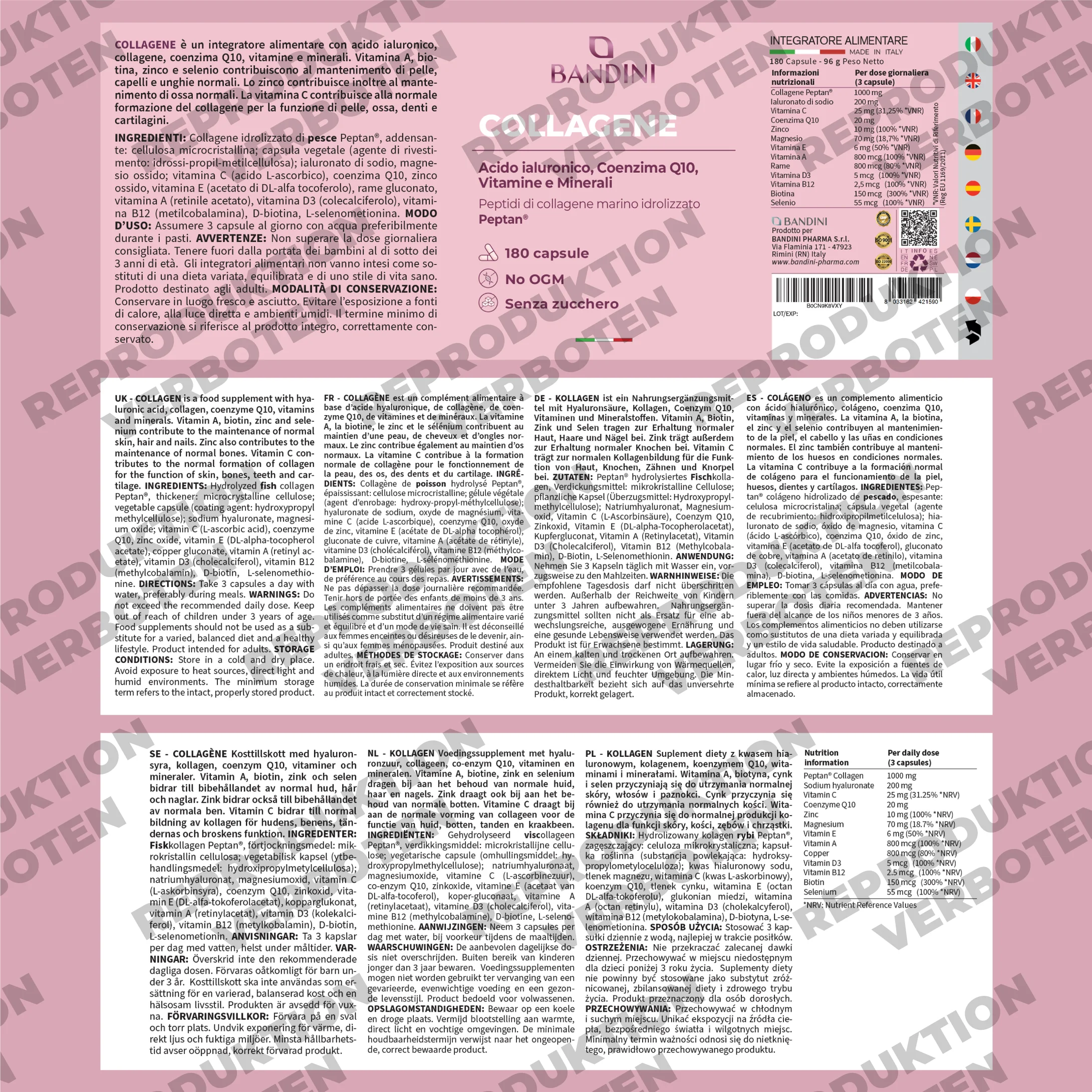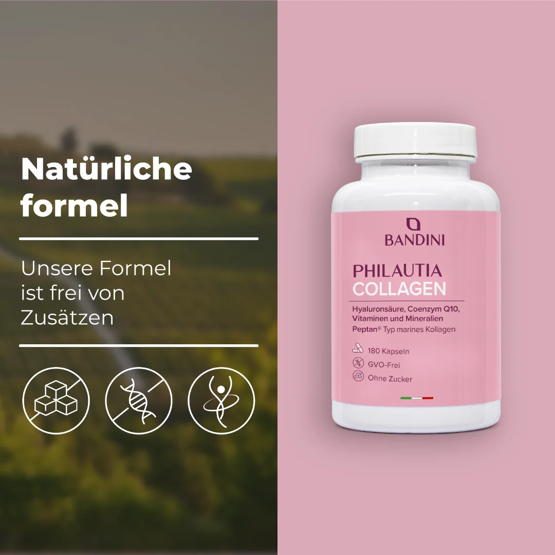 Die harmonische Kombination aus hochdosiertem hydrolysiertem Kollagen, Hyaluronsäure und Coenzym Q10 fördert eine tiefere Hydratation, macht die Haut weich, geschmeidig und straff, reduziert die Bildung neuer Falten und glättet tiefe Falten. Hydrolysiertes Kollagen fördert die Beweglichkeit der Gelenke, indem es die Gelenkschmierung sicherstellt und altersbedingte Entzündungen und Beschwerden reduziert; außerdem erleichtert es die Aufnahme von Kalzium und anderen für die Knochenstärke wichtigen Mineralien.