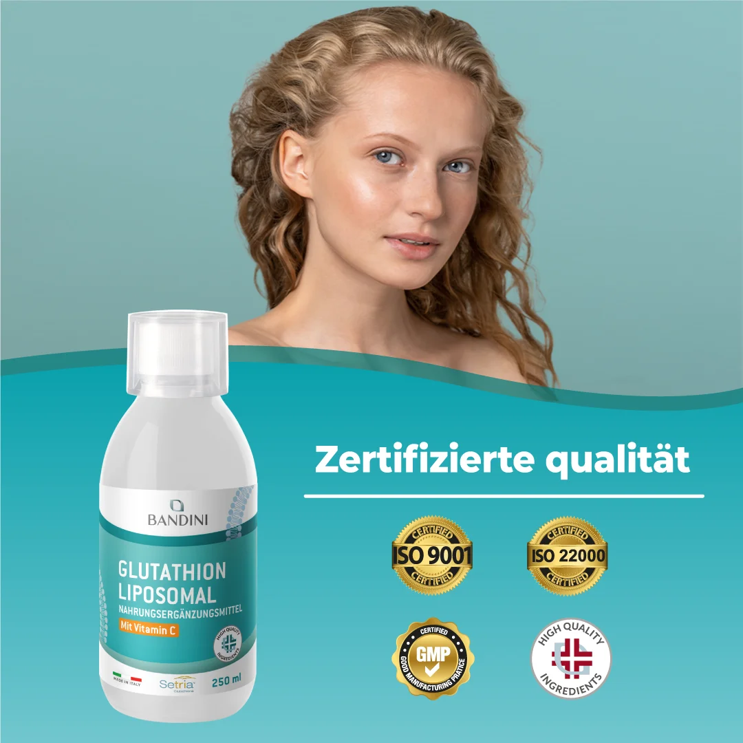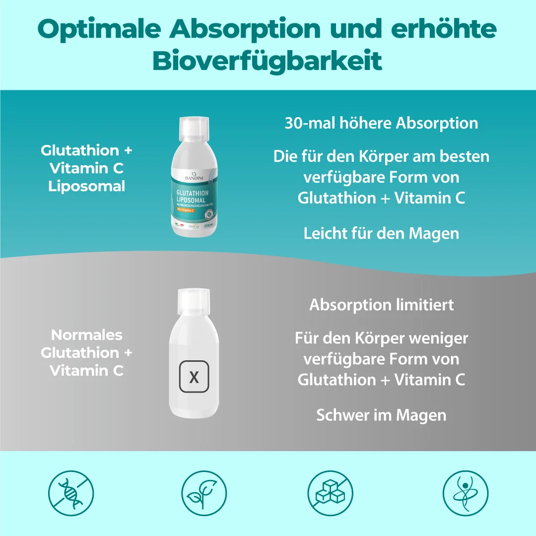Unsere Formel kombiniert 250 mg reduziertes Glutathion, das für die Unterstützung des zellulären Wohlbefindens bekannt ist, mit 790 mg Vitamin C, das zum Zellschutz vor oxidativem Stress beiträgt. Glutathion ist ein körpereigenes Molekül, dessen Konzentration jedoch mit der Zeit abnehmen kann. Vitamin C hilft, die Wirkung von Glutathion zu verstärken und das Immunsystem zu unterstützen. Die liposomale Technologie gewährleistet eine optimale Absorption.