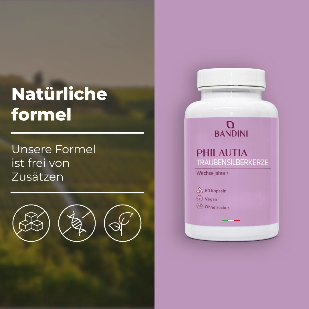 Unser Nahrungsergänzungsmittel basiert auf einer Kombination aus Traubensilberkerze, die seit Jahrhunderten für ihre natürliche Tradition geschätzt wird, und Rotklee, bekannt für seinen Isoflavongehalt. Diese sorgfältig ausgewählten und hochwertigen Zutaten fügen sich harmonisch in eine abwechslungsreiche Ernährung ein und bieten einen natürlichen und diskreten Beitrag für alle, die ihre tägliche Ernährung bewusst bereichern möchten.