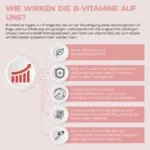 Vitamin B1 trägt zusammen mit B2, B6 und B12 zu einem normalen Energiestoffwechsel und einer normalen Funktion des Nervensystems bei. Vitamin B1 fördert die normale Funktion des Herzens. Vitamin B2 ist an der Erhaltung normaler roter Blutkörperchen und eines normalen Eisenstoffwechsels beteiligt und trägt zum Schutz der Zellen vor oxidativem Stress bei. Vitamin B2 hilft zusammen mit den Vitaminen B6 und B12 bei der Verringerung von Müdigkeit und Erschöpfung. Vitamin B2 wirkt zusammen mit den Vitaminen B6 und B12 auch gegen Müdigkeit und Ermüdung. Vitamin B6 in Kombination mit B12 trägt zu einer normalen Funktion des Immunsystems und einer normalen Bildung roter Blutkörperchen bei. Vitamin B12 greift auch in den Prozess der Zellteilung ein.