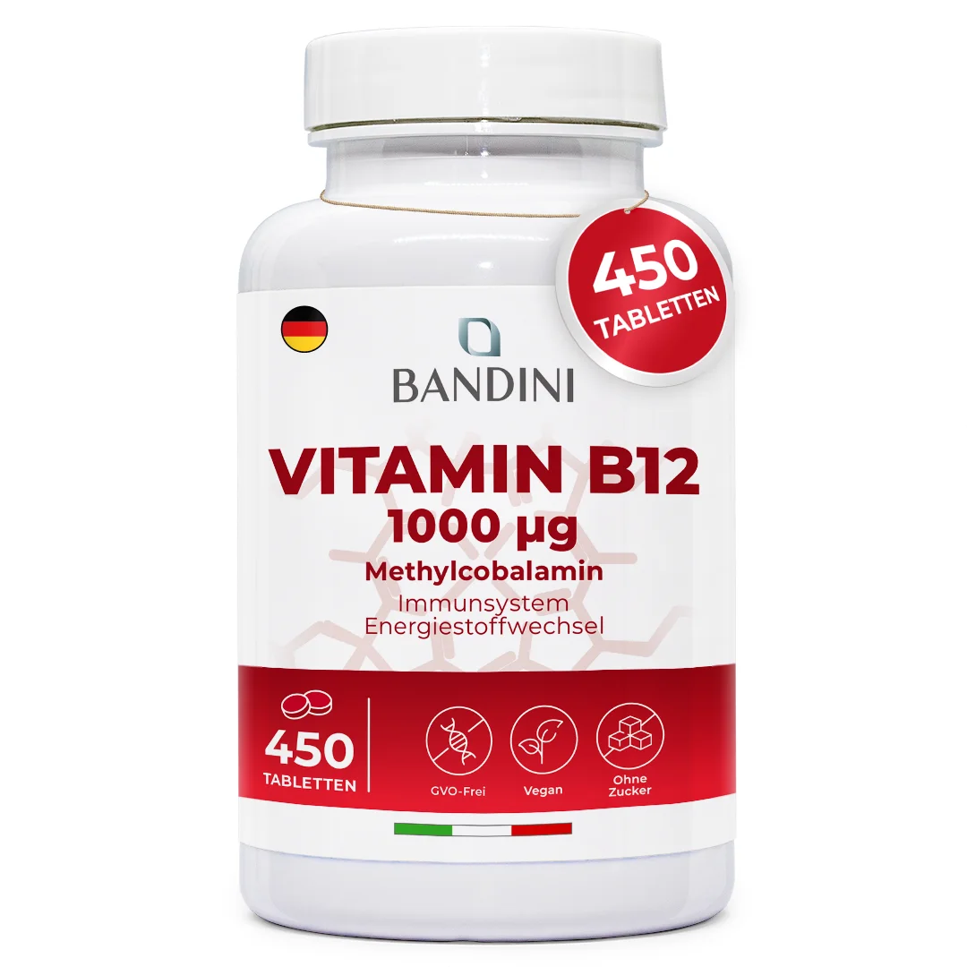 Hochdosiertes Nahrungsergänzungsmittel mit 1000 mcg Vitamin B12 pro Tablette. Die Tagesdosis beträgt 1 Tablette. Praktische Packung mit 450 Tabletten für eine Versorgung von mehr als einem Jahr.
