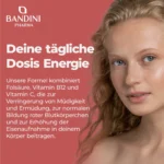 Vitamin B12 & Folsäure tragen zur Verringerung der Müdigkeit, zur Aufnahme von Eisen, zur Bildung roter Blutkörperchen, zum guten Funktionieren des Nervensystems, zur DNA-Synthese, zum Fettsäurestoffwechsel und zur Unterstützung bei der Schwangerschaft bei. Vitamin C unterstützt das Immunsystem, wirkt als Antioxidans, schützt die Zellen vor Schäden durch freie Radikale und ist für die Kollagensynthese sowie für den Aufbau von Haut, Knochen, Knorpel und Blutgefäßen unerlässlich.
