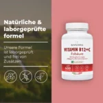 Unsere einzigartige Kombination aus Vitamin B12, Folsäure & Vitamin C trägt zur Eisenaufnahme und zur Verringerung der Müdigkeit bei. Unsere Formel ist besonders für Vegetarier geeignet, da sie die Aufnahme von Nicht-Hämeisen, das in pflanzlichen Lebensmitteln enthalten ist, besonders fördert. Wir verwenden nur die bioaktive Form Methylcobalamin als Vitamin B12, um eine maximale Bioverfügbarkeit und Wirksamkeit zu gewährleisten.
