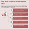 Vitamin B1 trägt zusammen mit B2, B6 und B12 zu einem normalen Energiestoffwechsel und einer normalen Funktion des Nervensystems bei. Vitamin B1 fördert die normale Funktion des Herzens. Vitamin B2 ist an der Erhaltung normaler roter Blutkörperchen und eines normalen Eisenstoffwechsels beteiligt und trägt zum Schutz der Zellen vor oxidativem Stress bei. Vitamin B2 hilft zusammen mit den Vitaminen B6 und B12 bei der Verringerung von Müdigkeit und Erschöpfung. Vitamin B2 wirkt zusammen mit den Vitaminen B6 und B12 auch gegen Müdigkeit und Ermüdung. Vitamin B6 in Kombination mit B12 trägt zu einer normalen Funktion des Immunsystems und einer normalen Bildung roter Blutkörperchen bei. Vitamin B12 greift auch in den Prozess der Zellteilung ein.