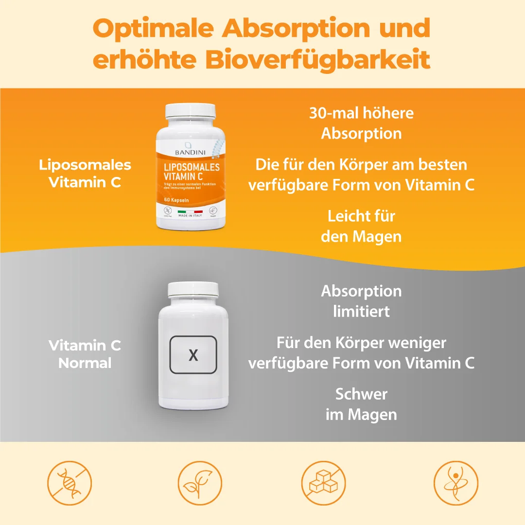 Unsere liposomalen Vitamin-C-Kapseln werden mit der liposomalen Technologie hergestellt, die eine Schutzschicht um die Wirkstoffe bildet. Die Phospholipide, die auch in den Zellmembranen vorkommen, sorgen dafür, dass die Wirkstoffe vor dem sauren Magenmilieu geschützt werden und garantieren die Aufnahme dieser Inhaltsstoffe direkt in deine Zellen. Vitamin C trägt zur normalen Funktion des Immunsystems, zum Energiestoffwechsel, zum Schutz der Zellen vor oxidativem Stress, zur normalen Kollagenbildung, zur Funktion des Nervensystems und zur Verringerung von Müdigkeit und Erschöpfung bei.