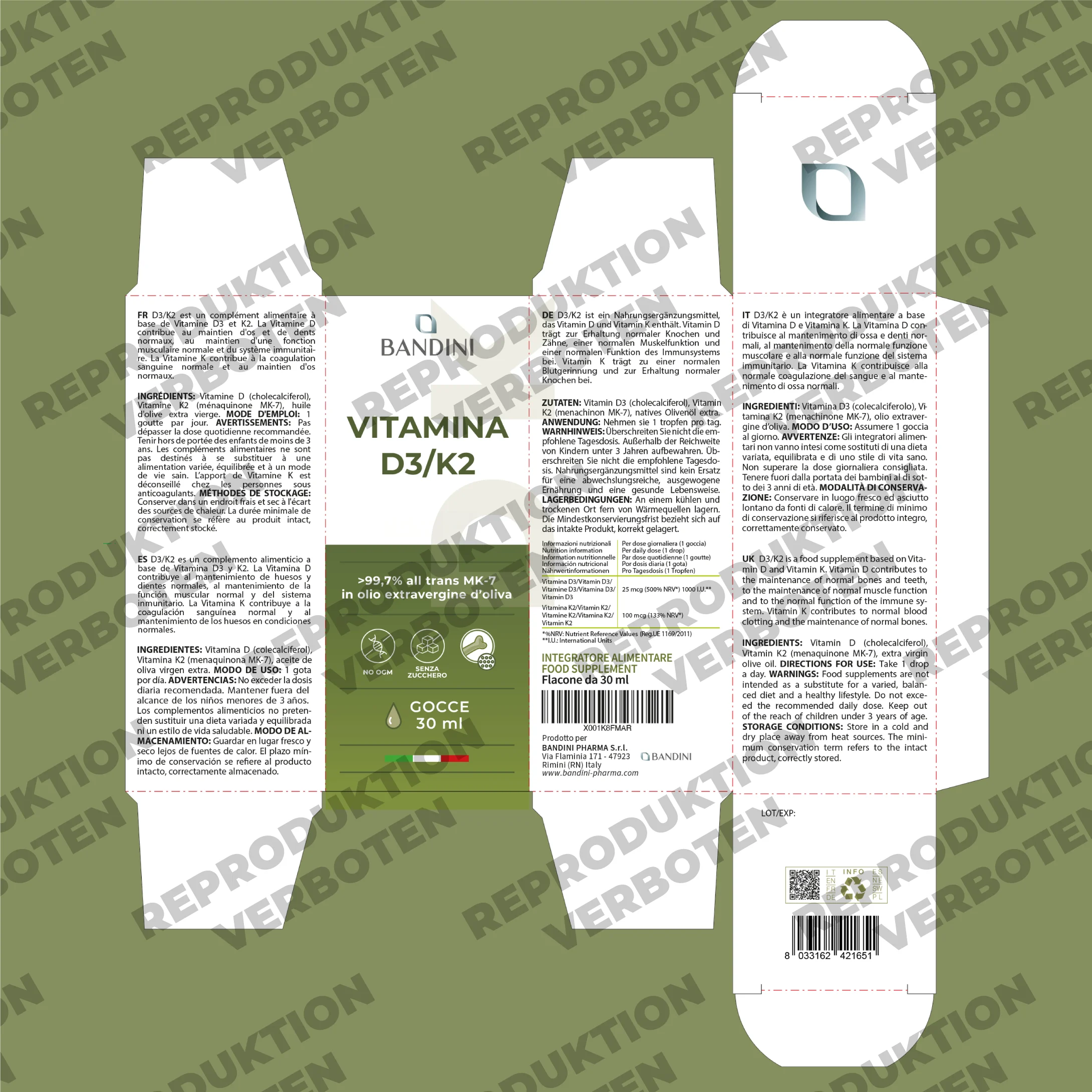 Vitamin D3+K2 Tropfen ist ein Supplement auf der Basis von Vitamin D und Vitamin K in nativem Olivenöl extra. Jeder Tropfen enthält 25 μg an Vitamin D und 100 μg an Vitamin K.